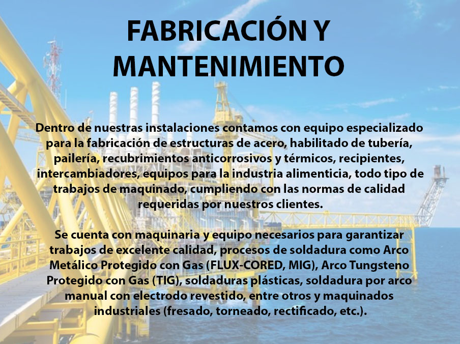 Somos una empresa 100% mexicana, que se enfoca en atender las necesidades públicas y privadas con servicios integrales para la industria energética, principalmente petróleo y gas. Contamos con una amplia experiencia en abastecimientos, mantenimiento y fabricación. Electricidad marina y terrestre, buceo comercial, salvamento, recuperación, así como en venta y renta de equipos y herramientas.