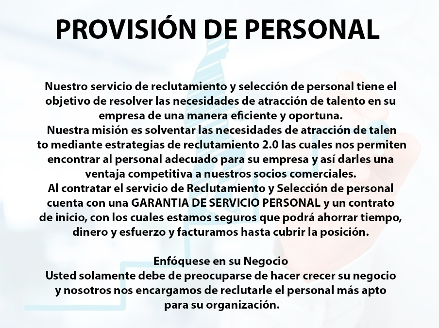 Es muy importante ofrecer nuestros servicios buscando siempre la satisfacción de nuestros clientes, brindando el mejor servicio y calidad, cumpliendo con las leyes vigentes de nuestro país en un ambiente laboral sano y respetuoso, comprometidos con el cuidado del medio ambiente y con nuestra sociedad.