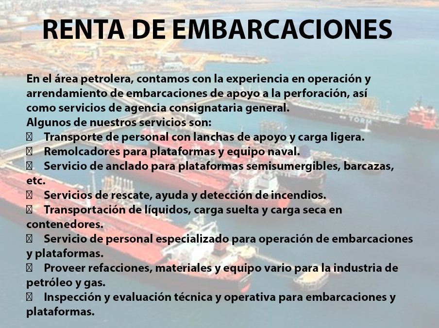 Tenemos la capacidad para solucionar sus necesidades de servicios en los puertos del Golfo de México: Progreso, Puerto de Seybaplaya, Cd. Del Carmen, Dos Bocas, Coatzacoalcos, Veracruz, Tuxpan, Tampico y Altamira.